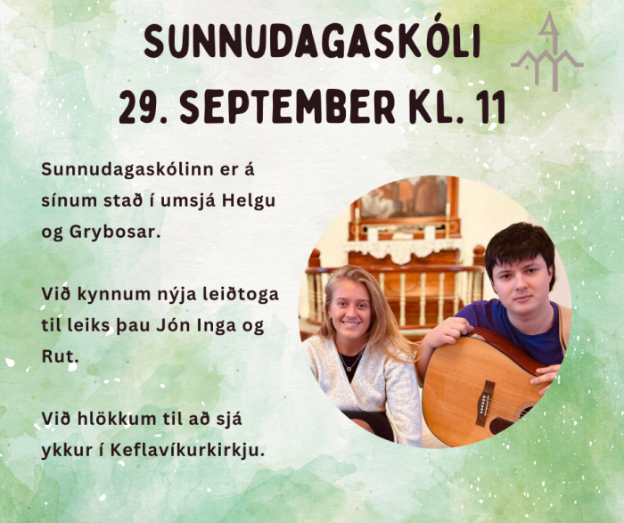 Það verður stuð og stemning í sunnudagaskólanum á sunnudag kl. 11. Við kynnum nýja leiðtoga til leiks þau Jón Inga og Rut. Söngur, brúður og Biblíusaga Verið öll hjartanlega velkomin.