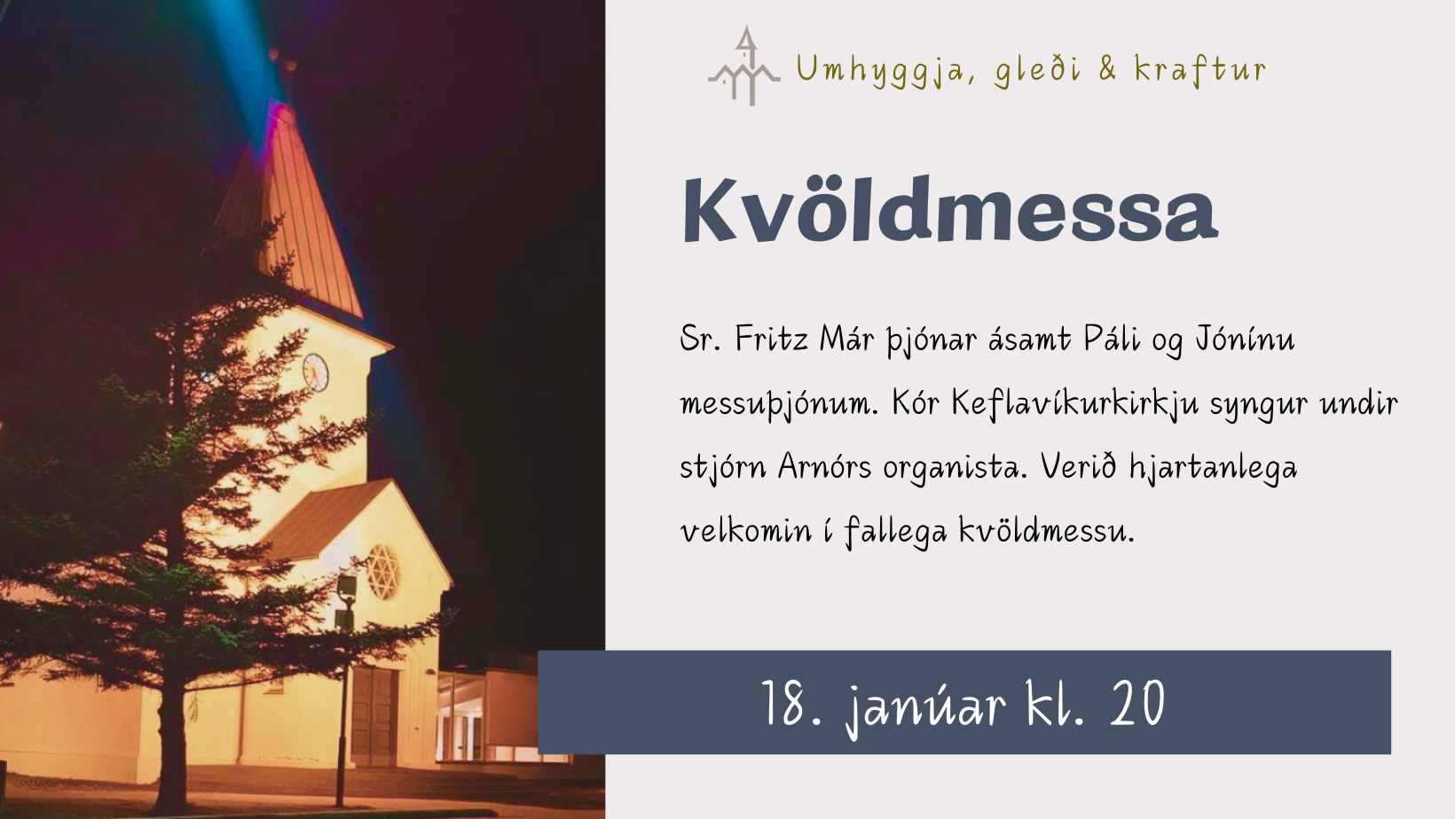 Sunnudag 18. janúar er kvöldmessa kl. 20