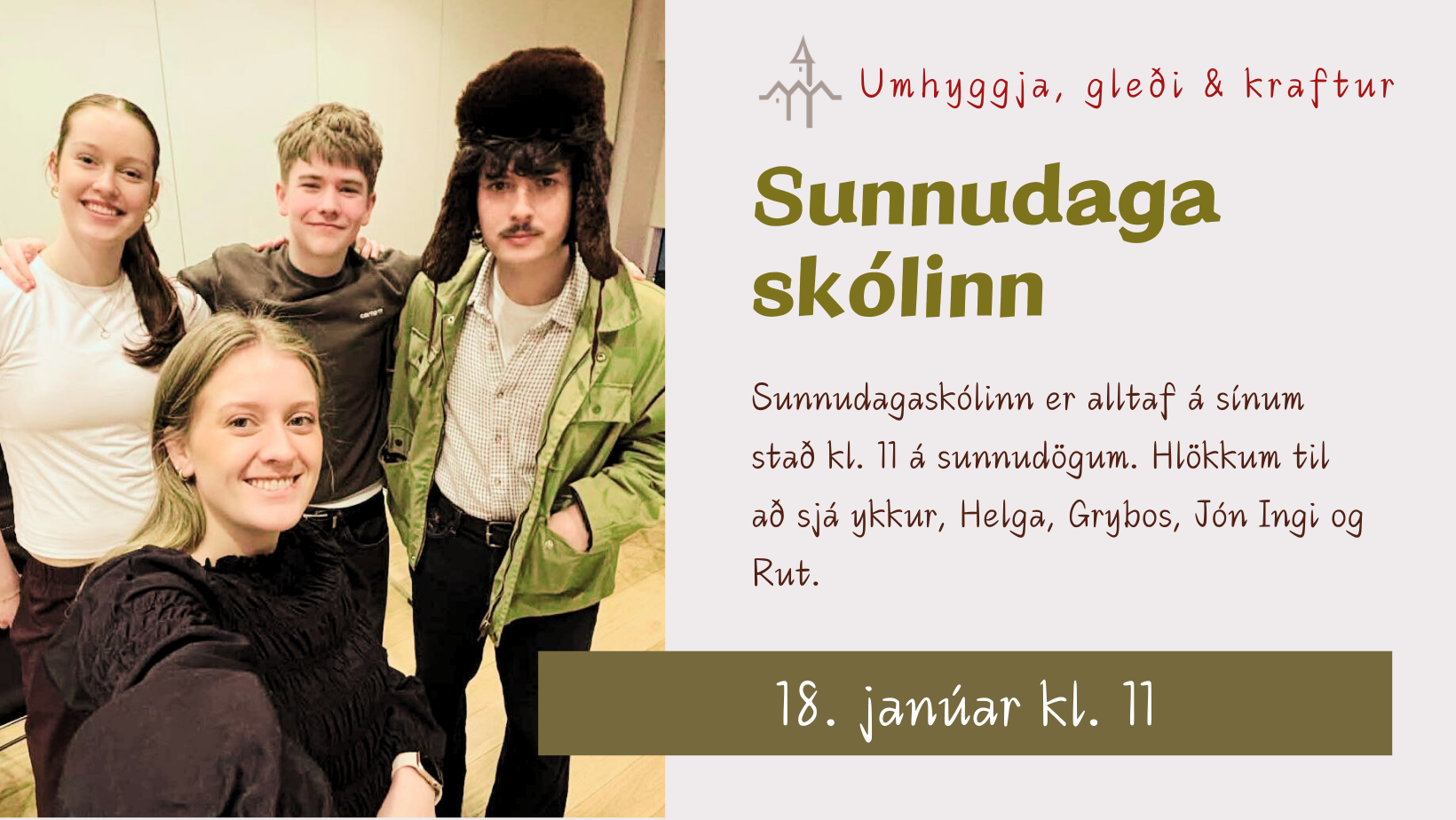 Leiðtogarnir Jón Ingi, Rut, Grybos og Helga hlakka til að sjá börnin á sunnudag 18. jan kl. 11. Sjáumst!