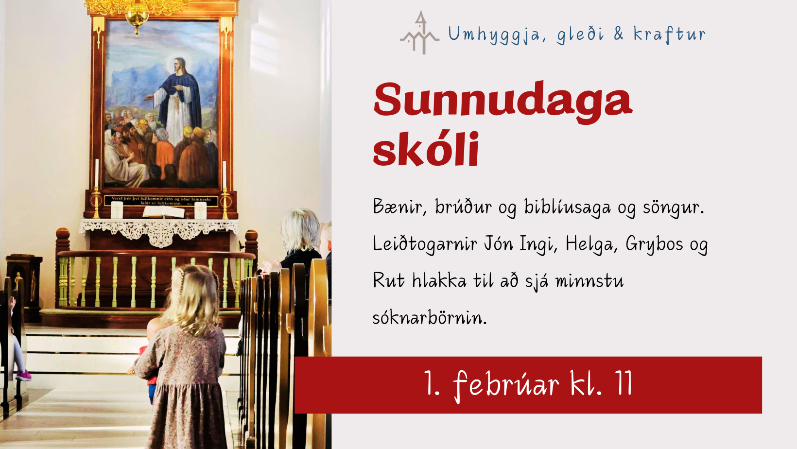 Á sunnudag 1. febrúar er sunnudagaskólinn kl. 11. Þar munu leiðtogarnir Helga, Jón Ingi, Rut og Grybos vera með [...]